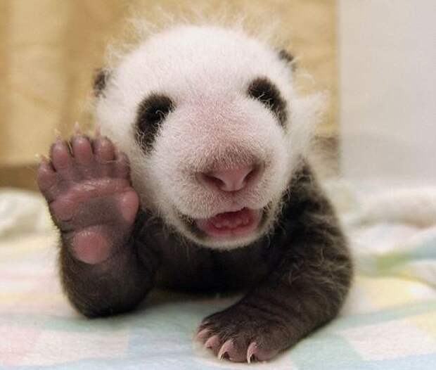 Эта крошечная панда выглядит, как будто не может ждать, чтобы выйти и встретить большой мир, улыбаясь и пытаясь помахать лапкой в своем инкубаторе в китайском научном центре в провинции Сычуань.